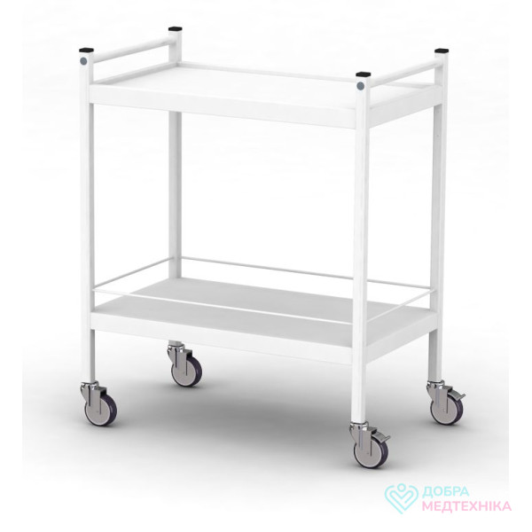 - Стіл комплектується 2-ма полицями з листового металу і 2-ма ручками з боків для зручності переміщення. Верхня полиця має профільний край, а нижня – бар'єр, що захищає, що захищає медикаменти та інструменти від випадкового падіння.