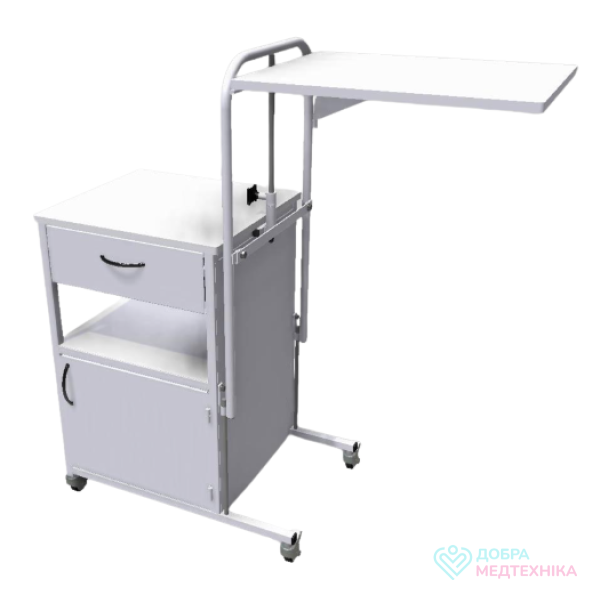 - Медична тумбочка оснащена полицею-столиком, яка регулюється по висоті.