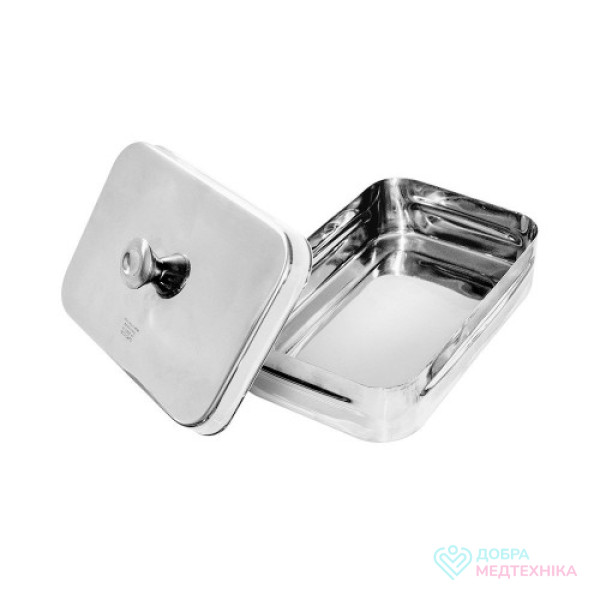 • Контейнер медичний з кришкою виготовлений з полірованої аустенітної нержавіючої сталі AISI 304. Висока корозійна стійкість досягнута завдяки великому вмісту хрому в сплаві металу. Через низький вміст вуглецевої сталі метал не магнітиться.